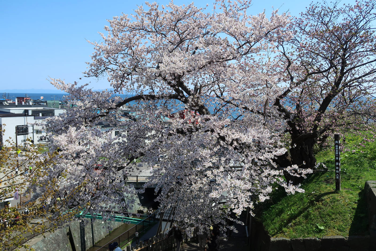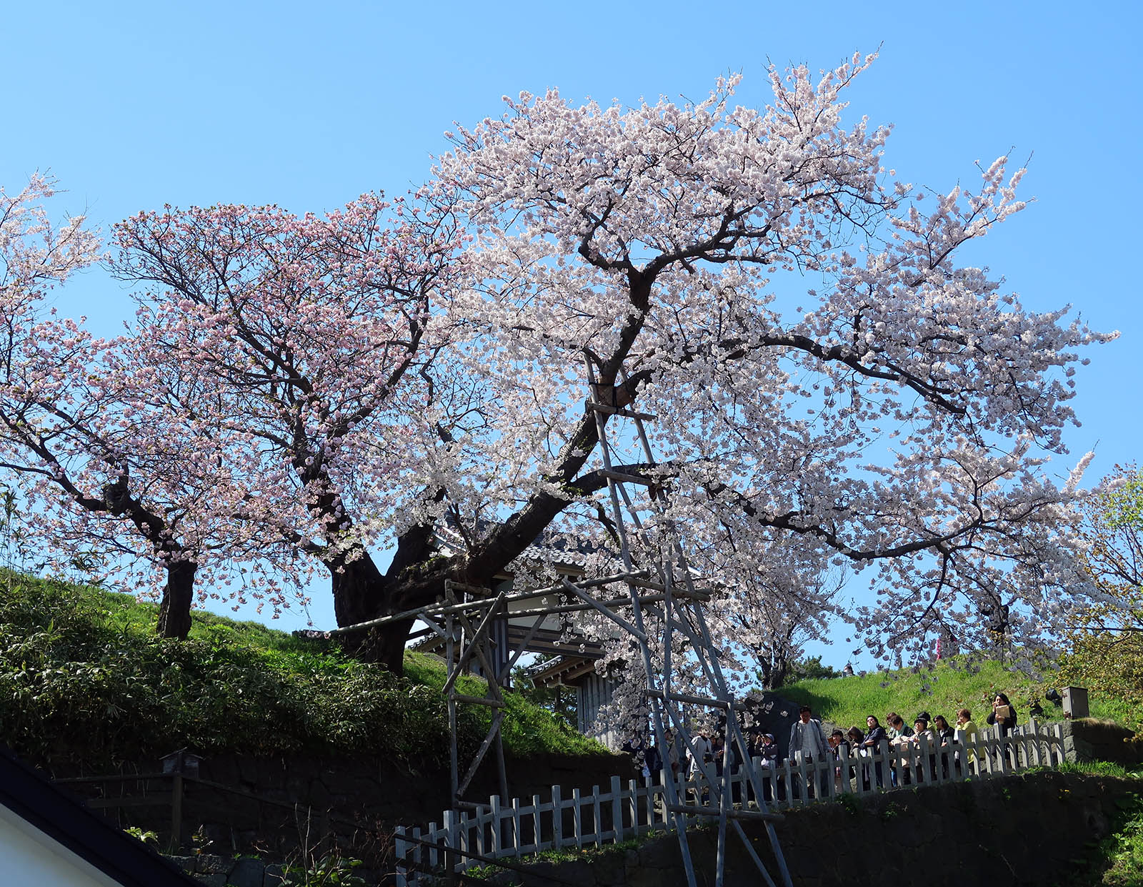夫婦桜は天神坂門にある一本桜。ソメイヨシノとナデン(マツマエハヤサキ)が1本の根から育つ桜の木である。