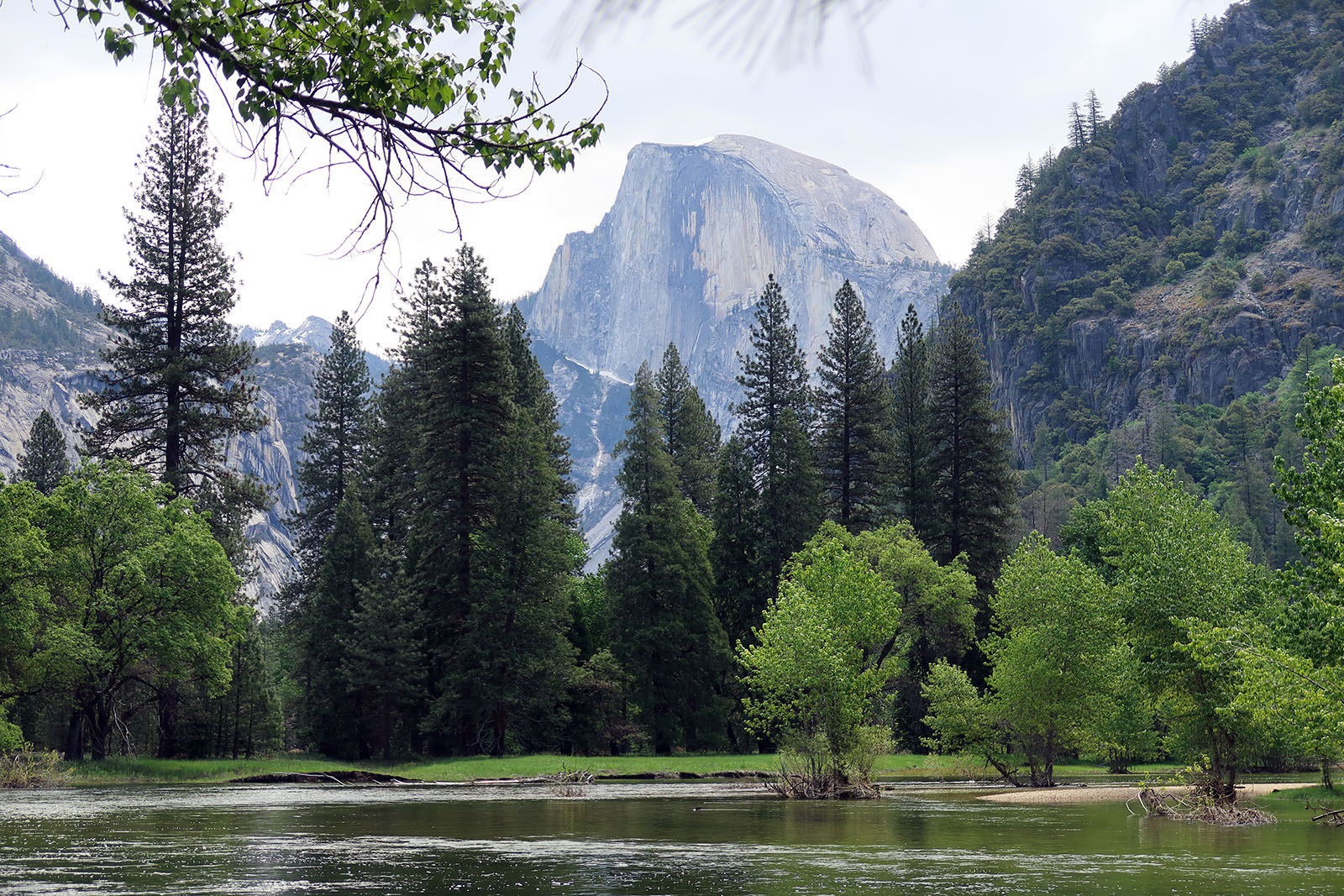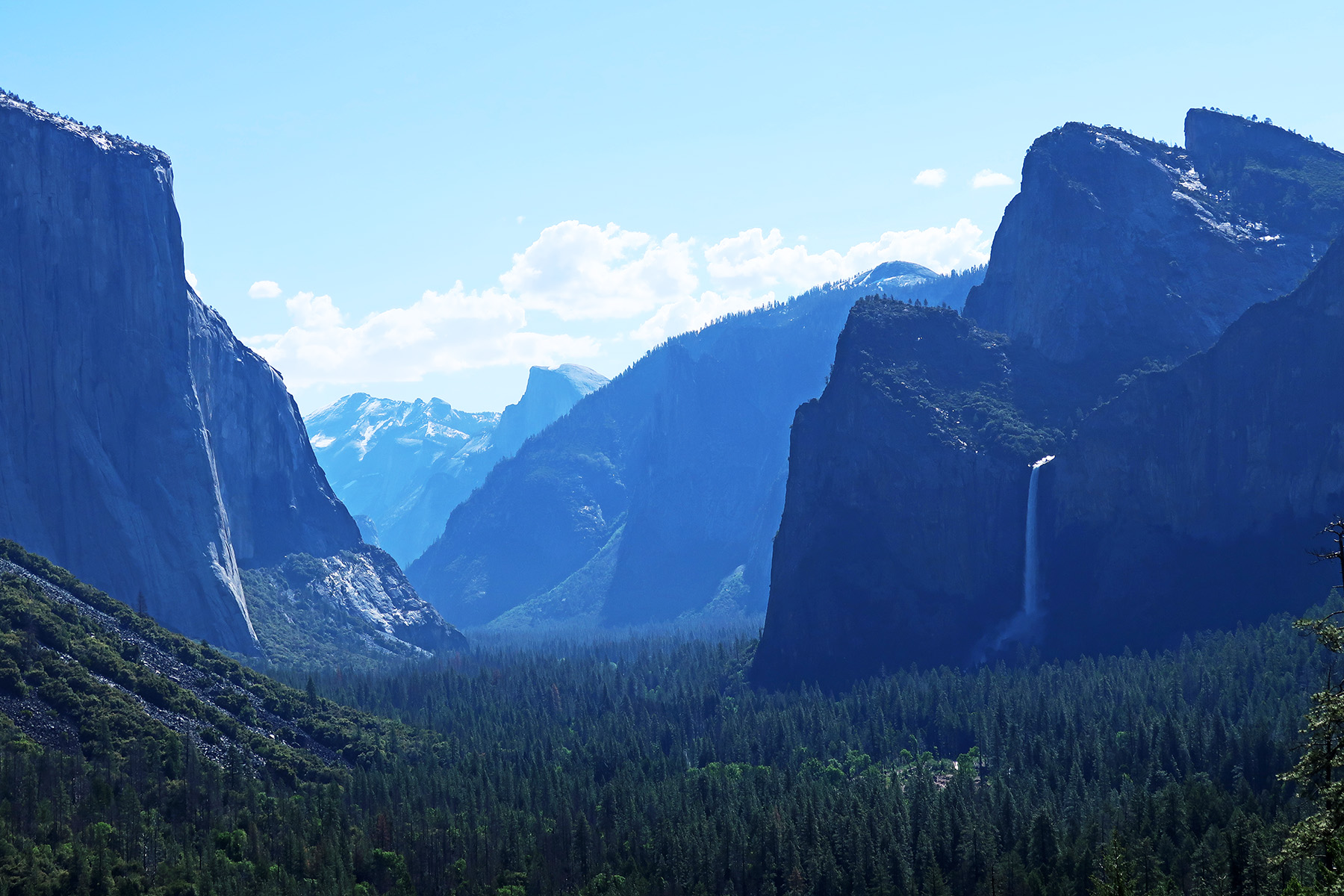 氷河に削られた巨大な谷「ヨセミテバレー」の絶景 左:エル・キャピタン, 奥:ハーフドーム, 右:センチネルロック, 右手前:カセドラルロック, ブライダルベール滝