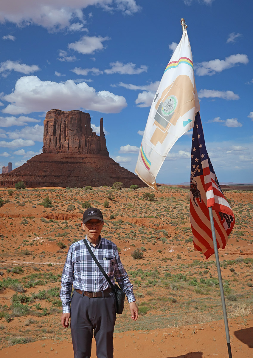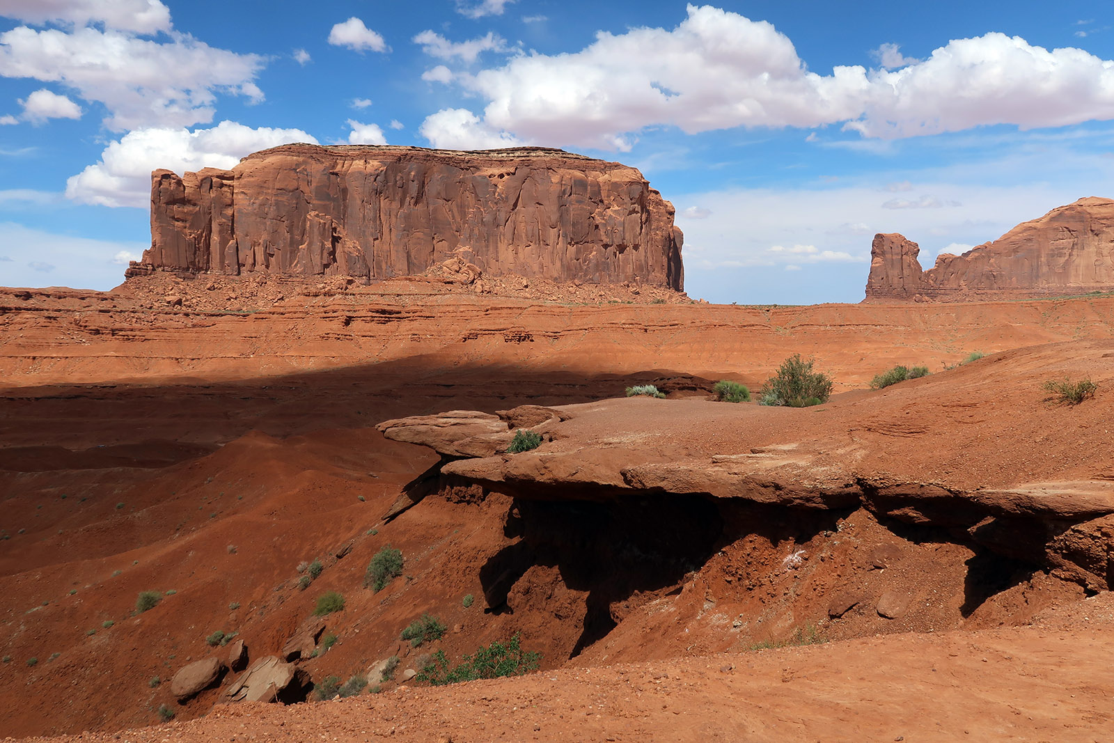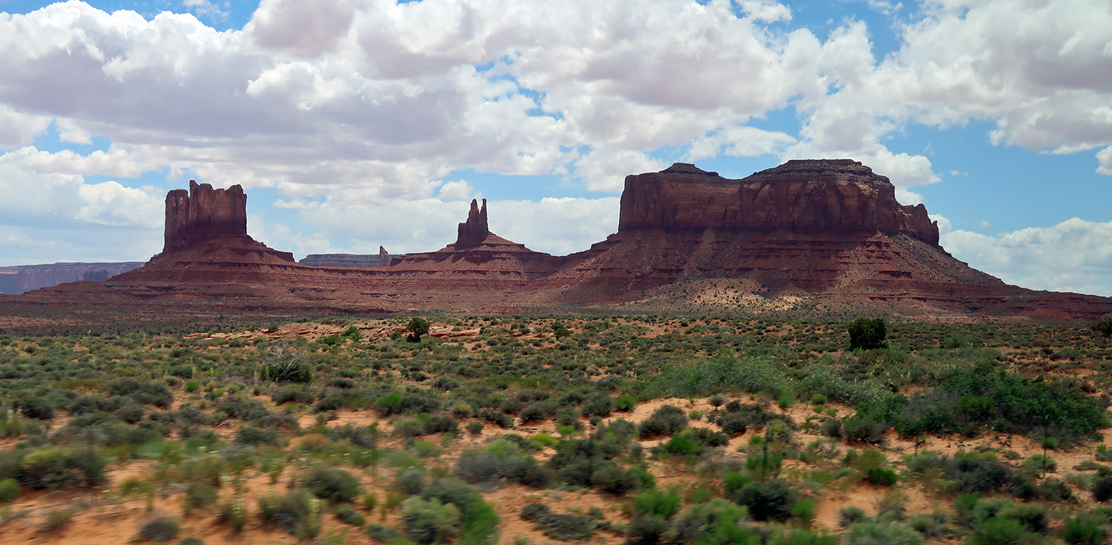 モニュメントバレーはUSAのユタ州とアリゾナ州かけて広がる地域で、メサと言われるテーブル状の台地や、それが侵食された岩山ビュートが点在し、モニュメントが並んだ景観を示している。国立公園、国定公園、州立公園のいずれでもなく、ナバホ族居住地に属しており、モニュメントバレーはナバホ族の聖地。このエリアの正式名称は、モニュメントバレー・ナバホ族公園(Monument Valley Navajo Tribal Park)といい、アメリカ政府から大幅な自治権を与えられ、独立国に近い存在である「ナバホ国」の国立公園です。公園の管理もナバホ族の人々によってなされています。
