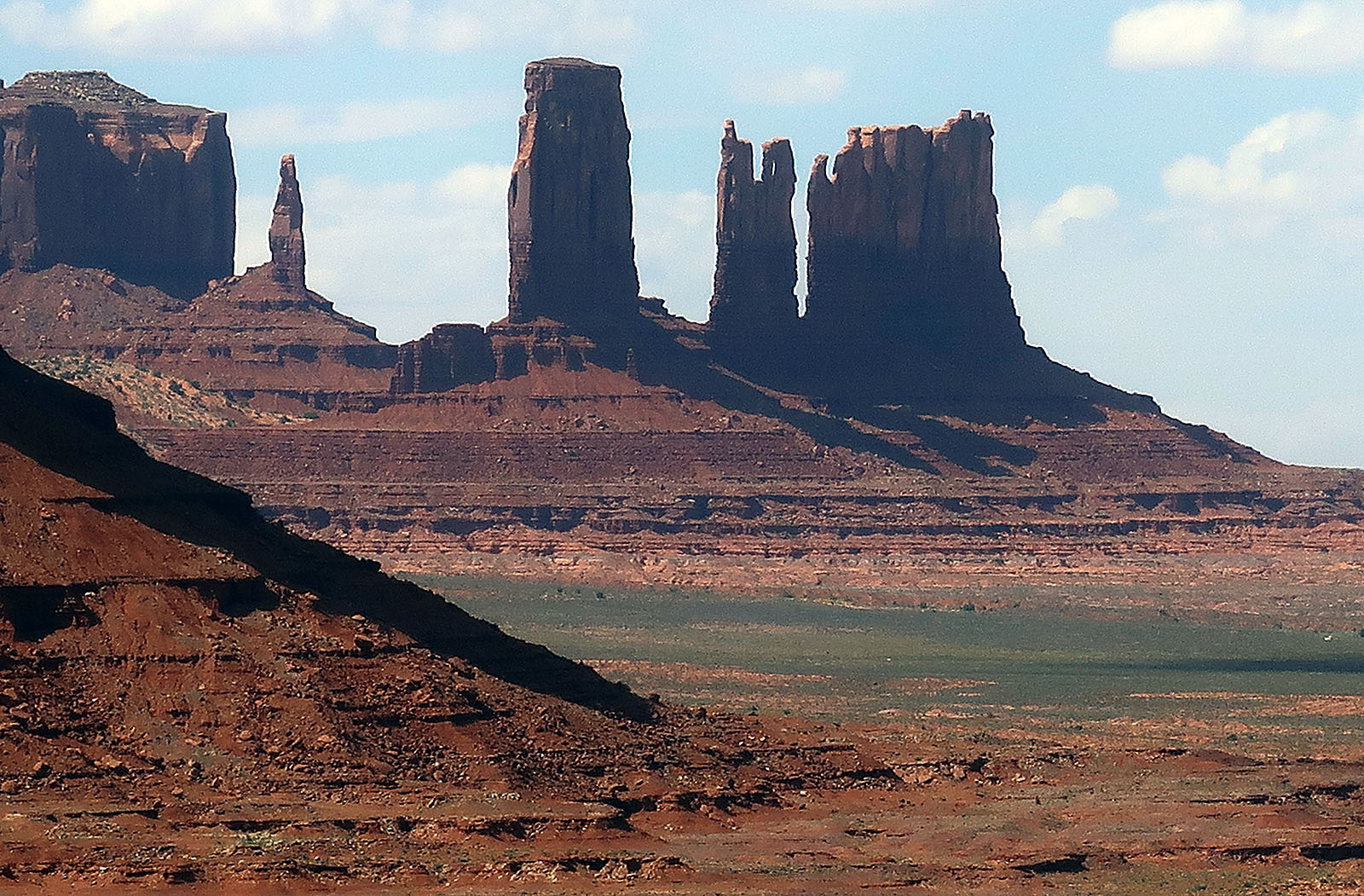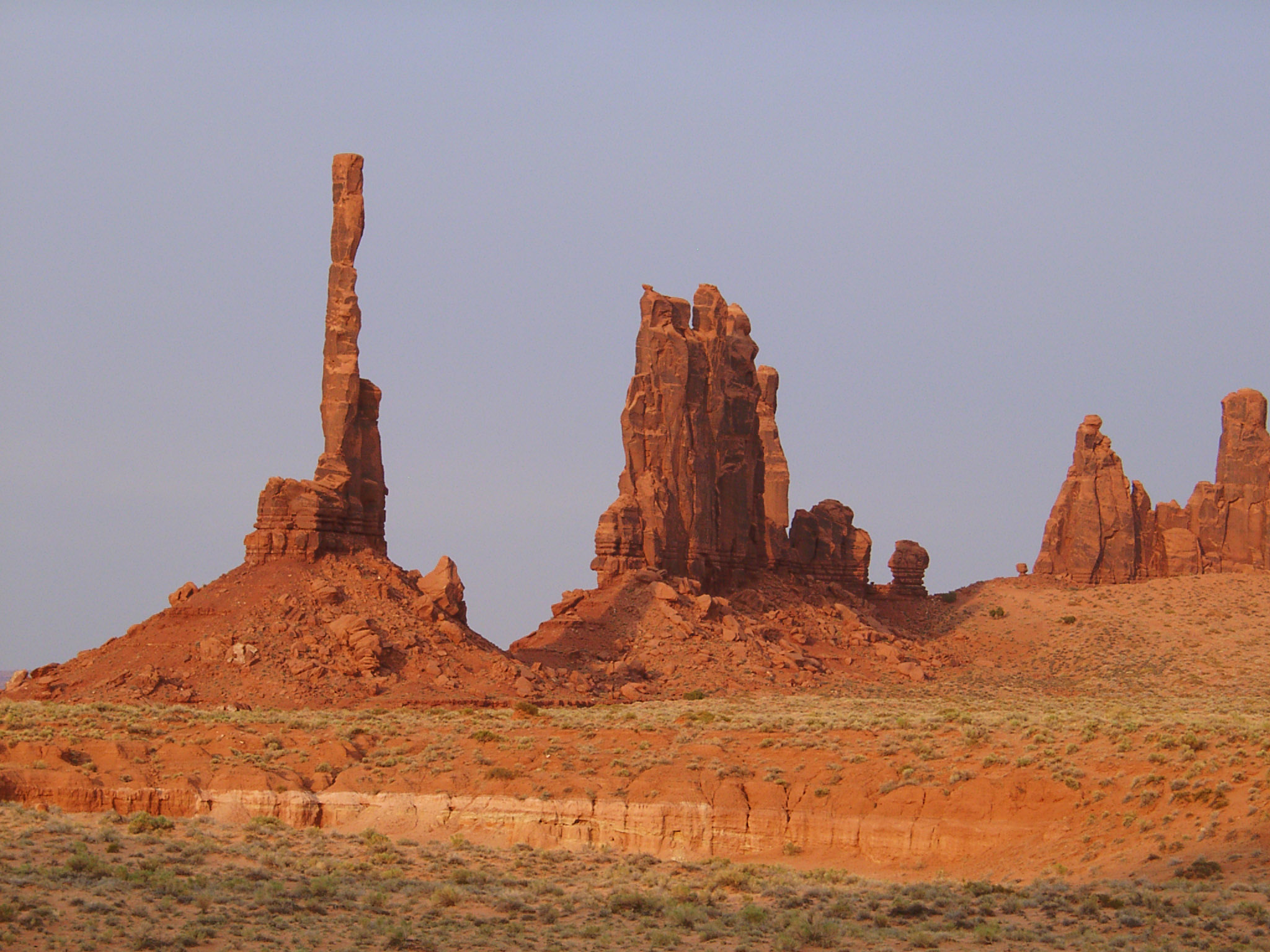 大地から突き出している岩山は、ビュート(butte)と呼ばれています。残丘という意味。高さは300m程あります。かつては、ここもグランド・キャニオンのような渓谷だったが、年月をかけて浸食され残った部分が少なくなって今の形となりました。