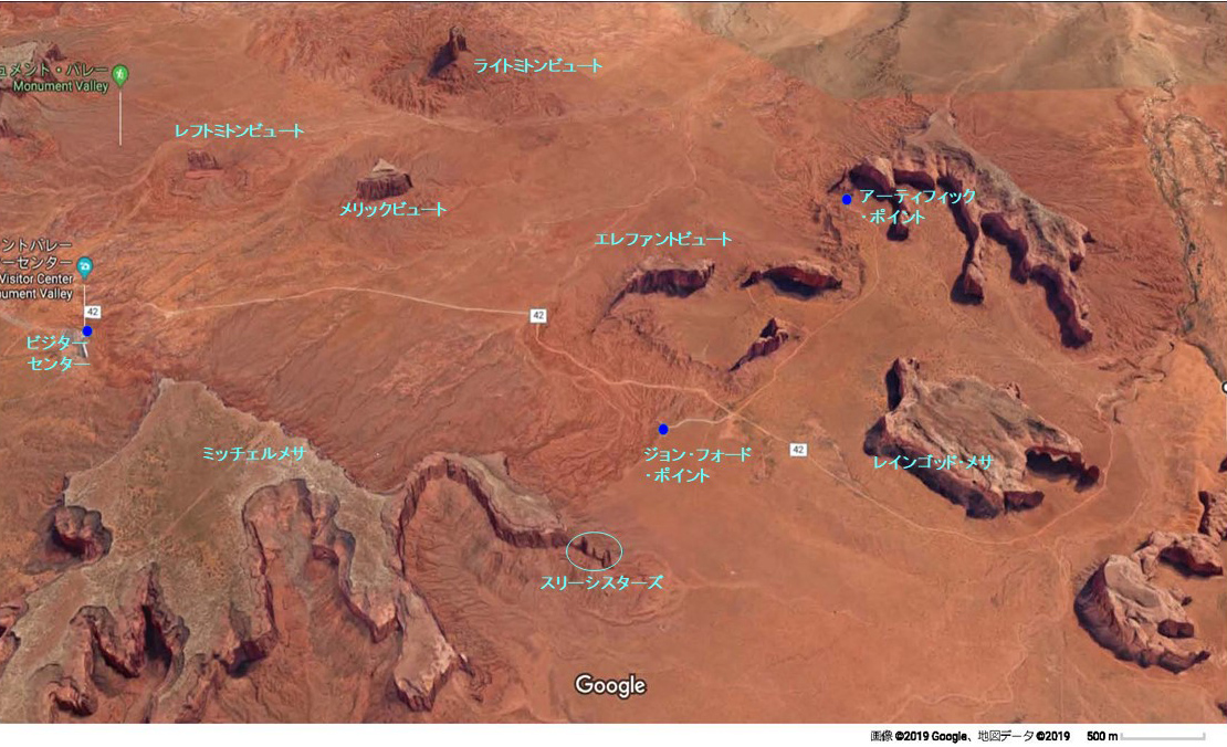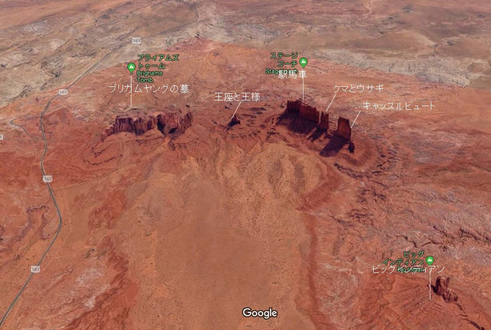 左手前:メリックビュート、その奥:センチネルメサ、右:ライトミトンビュート、遠方は左から、イーグルロック、ビッグインディアン、ブリガムヤングの墓、駅馬車など