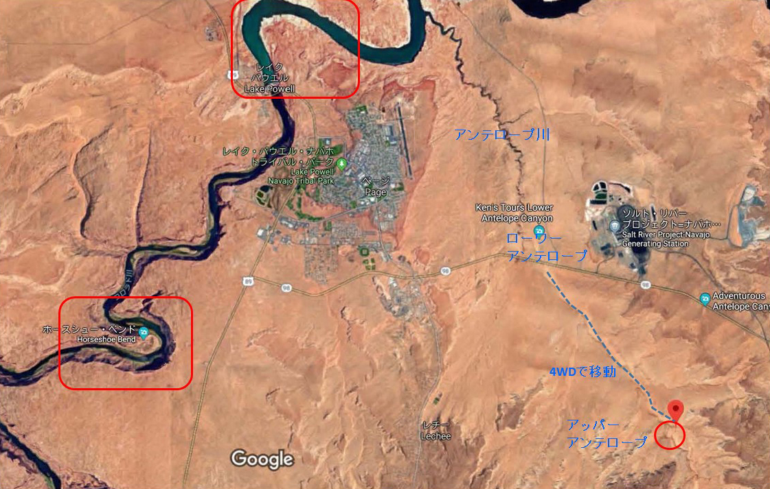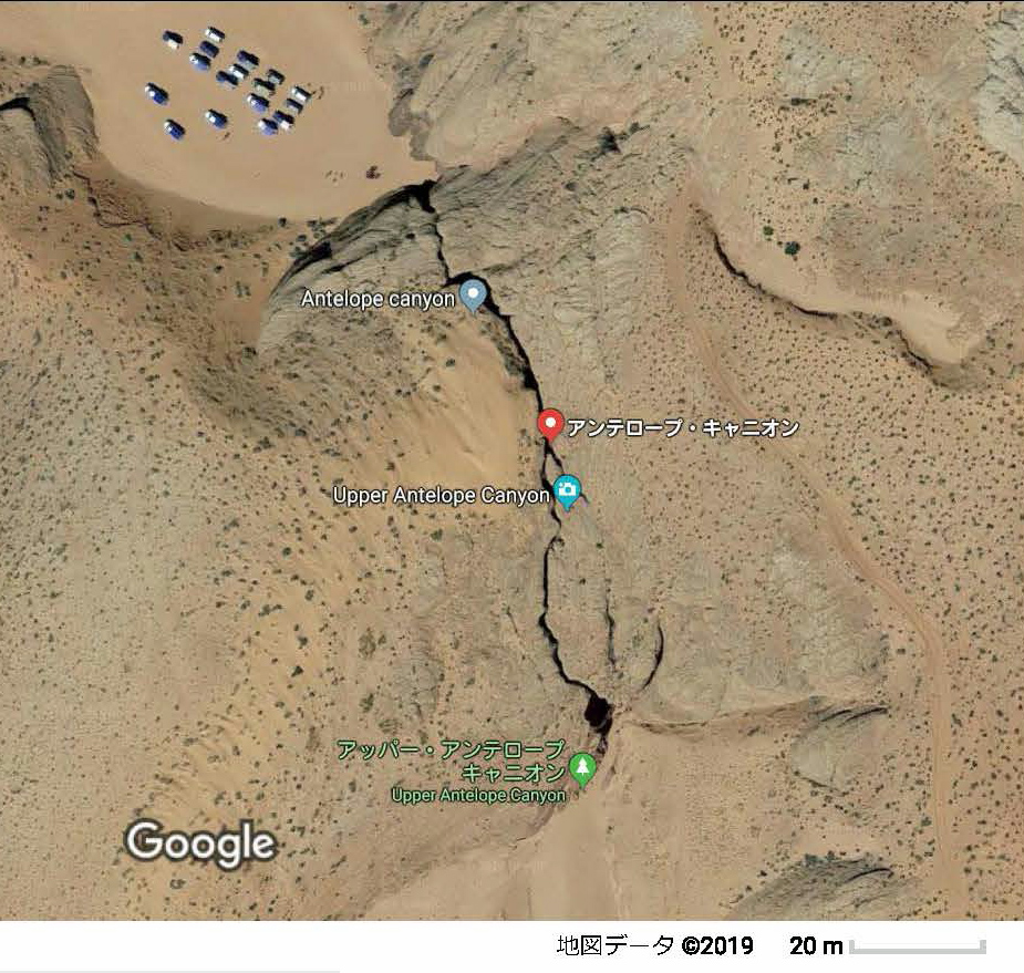 アッパーアンテロープの衛星写真(拡大) スロットキャニオンは岩の狭い割れ目で、長さは100m程度と小さい 入口に4WD車が並んでいる。