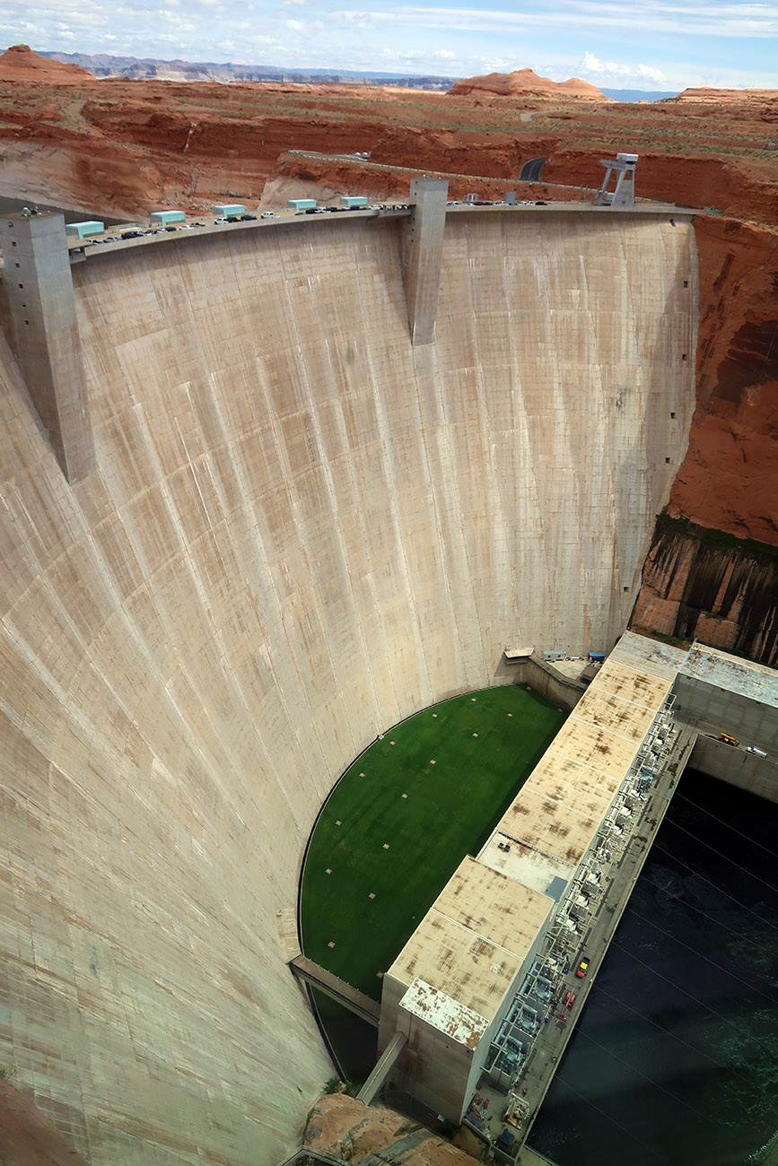 グランキャニオンダムと発電所 ダム下流には8基の水車が設備され、最大出力132万KWの水力発電所がある。しかし、生活水や灌漑水を確保するため発電稼働率は低い。ナバホ族の人はダムに反対しているためこの電力は使わない、アンテロープの近くに火力発電所を作っている。