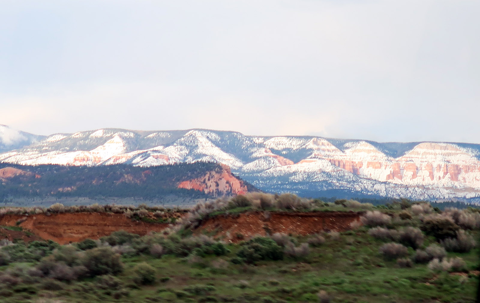 バスから眺める赤白の岩の景色