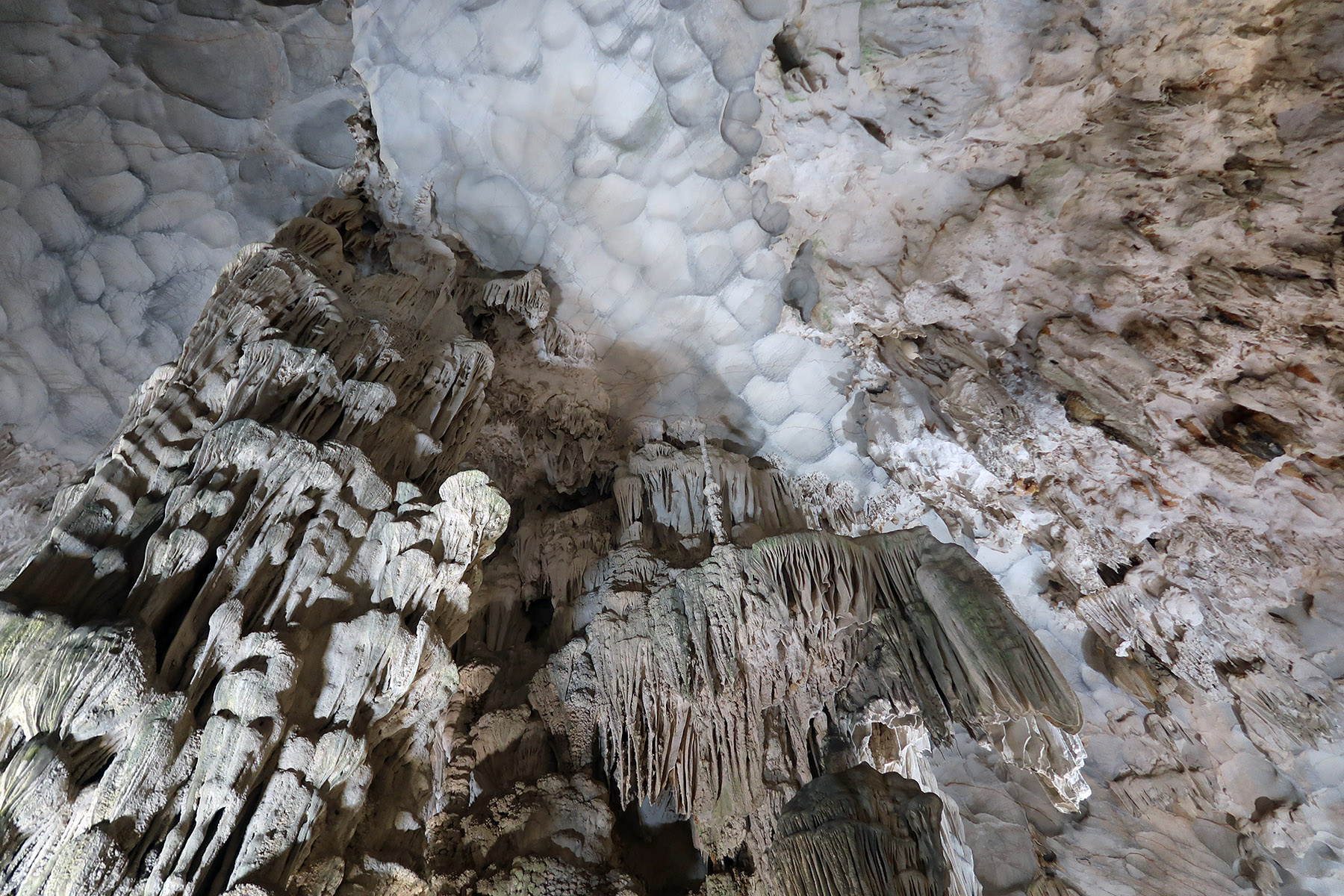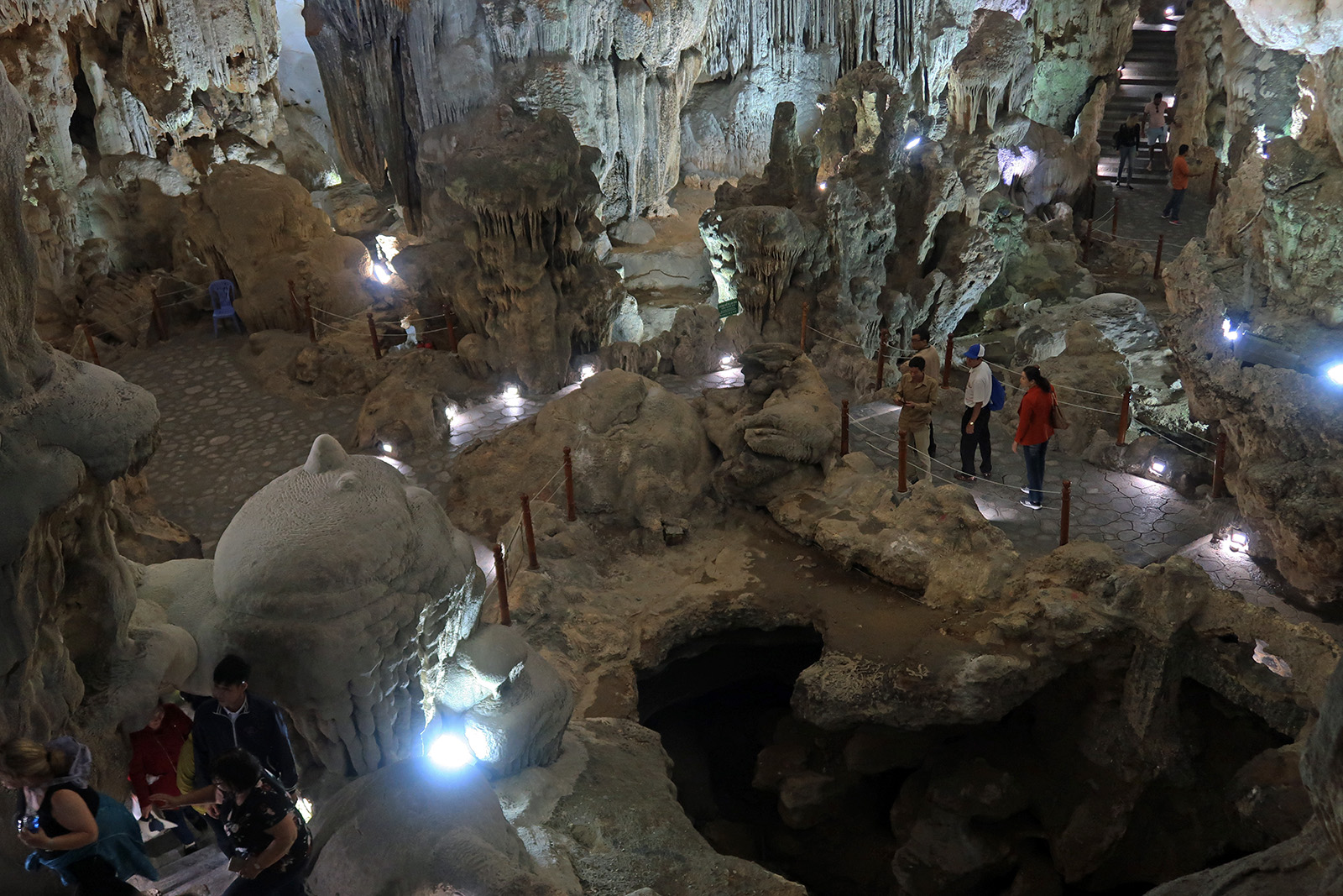 ハロン湾に点在する多くの島に鍾乳洞があるが、ダウゴー島にあるティエンクン洞は、天宮の意味がある。3時間の短いクルーズでも立ち寄る最もポピュラーな鍾乳洞。鍾乳洞の内部は高さ20m、幅10m程でそう広くはないが青や緑などにライトアップされていて幻想的な世界となっている。