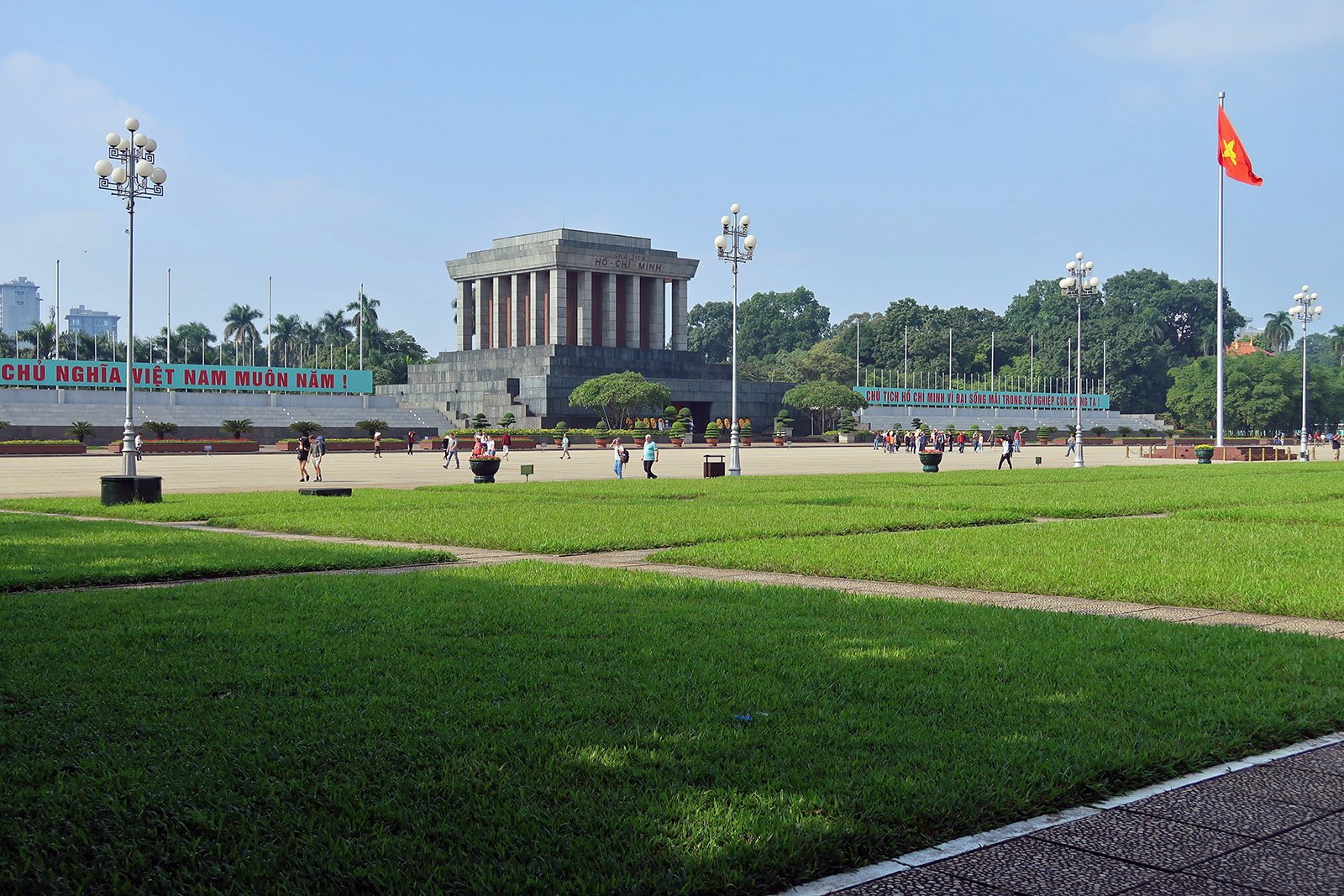 ベトナムの民族解放と独立のために南北統一に生涯をかけた、今もベトナム国民の父として敬愛されるホーチミンの亡骸が眠る場所。廟は、バーディン広場の奥にあり、1973〜1975年にベトナム全土から集められた自然の素材を用いて建造された。一年中冷房の効いた内部の部屋に永久保存処置を施されたホー・チ・ミンの遺体が安置されている。廟の中はベトナム人民軍の軍人により警護されており、私語厳禁で立ち止まることは許されない.