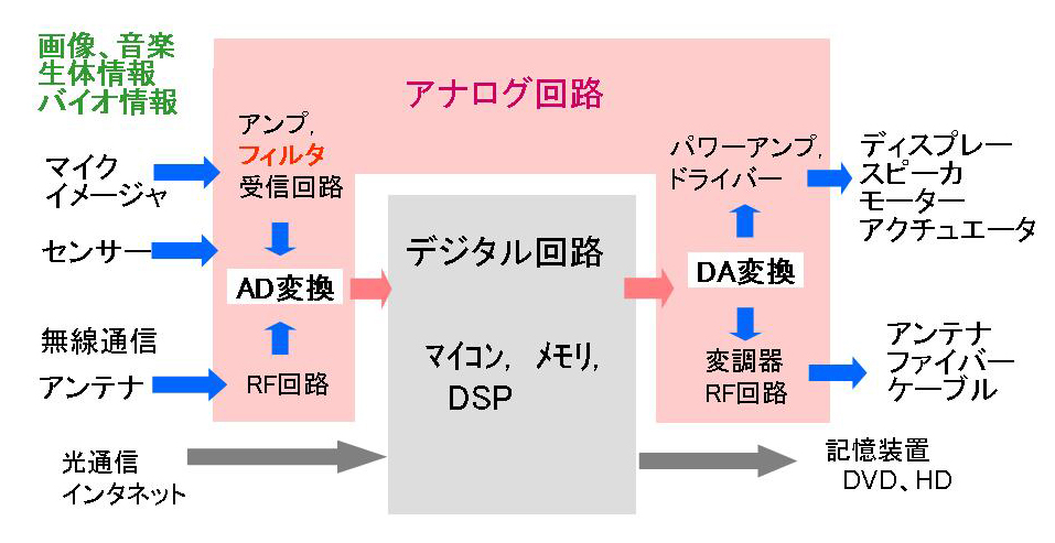 ○ 我々が日常,見たり聞いたり感じたりする多くの情報はアナログです.我々が使う携帯電話やTVなどのシステムではアナログ情報を受信,センシングして,それをデジタルに変え,処理・記憶・通信して,又,人間に分かり易いアナログに戻すことが必要です. ○集積回路にはアナログとデジタルの両方が必要で,デジタルは計算機を使って自動設計し易いですが,アナログはそうはいきません. ○アナログ回路は多種多様で,特性や仕様が複雑で,設計には経験や勘が必要です. アナログに研究・開発する要素が多く重要になっています. ここにアナログ回路技術を研究・開発する価値と需要,人材の育成の必要性があります. |