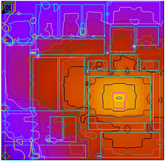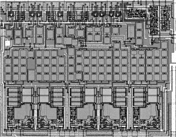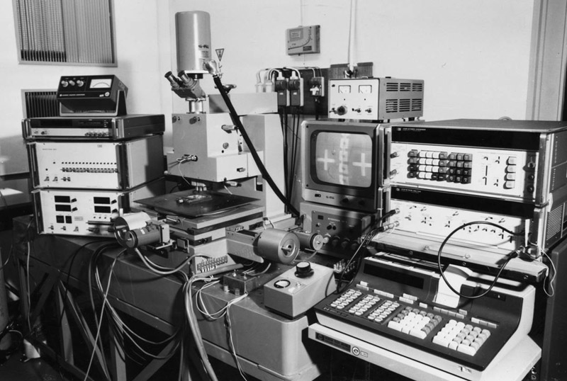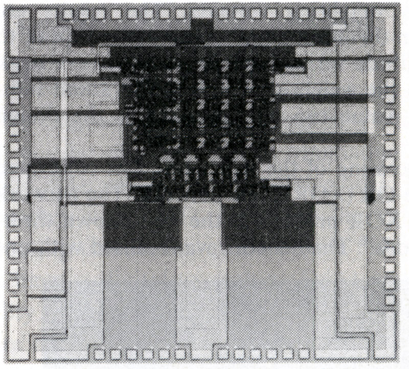 フィルタの特性(振幅と位相)を測定して,所望の特性になるように,薄膜抵抗素子をカットして抵抗値を上げて調整する.これを機能トリミングという. 混成ICを移動させるステージ,抵抗をカットするYAGレーザー,フィルタの特性を測定するネットワークアナライザー,これらを制御するコンピュータと制御ソフトウェアで構成されている. 右の写真に示すように,混成ICの抵抗パターンにははしご形の調整片を設けて,加工の高速化と切断面を減らすことにより,経時特性変化を抑えるように設計している. |