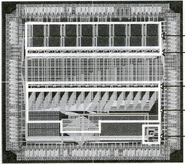 左は完成品でサイズは4cm x 4cm程度,上にある黒い■がオペアンプチップ,真ん中の2個の白い基板の裏にはCが,下の白い基板の裏に はRが形成されているいる.真ん中の基板は,C基板とR基板とオペアンプを搭載する前のメイン基板,縦長の基板はR基板で, 多数の抵抗が形成されている.その拡大写真が一番右にある.小さい基板はC基板で,3個のコンデンサーが形成されている. メイン基板には穴が空け,これを通してレーザーをあてRの値を調整して,精度を高めます. |