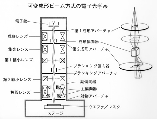 紫外線を使って写真の原理でパターン生成していたが,パタン寸法の微細化により,光の波長程度以下になると,描画のパターンがぼやけて,精度が得にくくなる. 波長の短い電子ビームを使って描画する方法があり、電子顕微鏡と同じ電子光学コラムを用いてビームをミクロン以下に収束させて.それをスキャンしてパターンを描画する. LSIの設計データに基づいて,電子ビームの位置を高精度10nmに制御する. 膨大な数のパターンの描画時間を短くするために位置を高速に制御する. このために高速,高精度なDA変換器が必要,(18-20bit,セットリング時間ナノ秒オーダー) ビームのON/OFFを高速に制御するブランキング機能も必要である. 電子ビーム描画装置を用いて,光を使って露光するためのマスクを描画する方法と,Siウェハ上にパターンを直接描画する方法がある. |