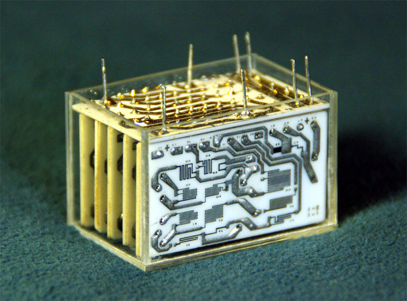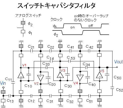 そこで,コイルを用いないでフィルタを作り,小型・軽量にしようという考えで研究・開発されたものです.現在主流になっているシリコンチップ上に形成した集積回路の前には混成集積回路(ハイブリッド)があり,この技術実現するのに適しています. 抵抗(R)とコンデンサー(C)とアンプを用いることにより,等価的にコイルの機能を実現できるという原理で動作します.RとCの値を変えると,周波数が変わるので,特性調整ができます. |