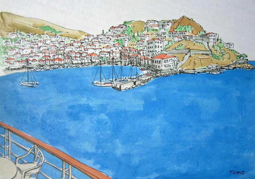 作品16 旅の思い出9 [制作2000年8月] ギリシャ エーゲ海クルーズ イドラ島 (紺碧の海から見る まぶしい島の家並み) |