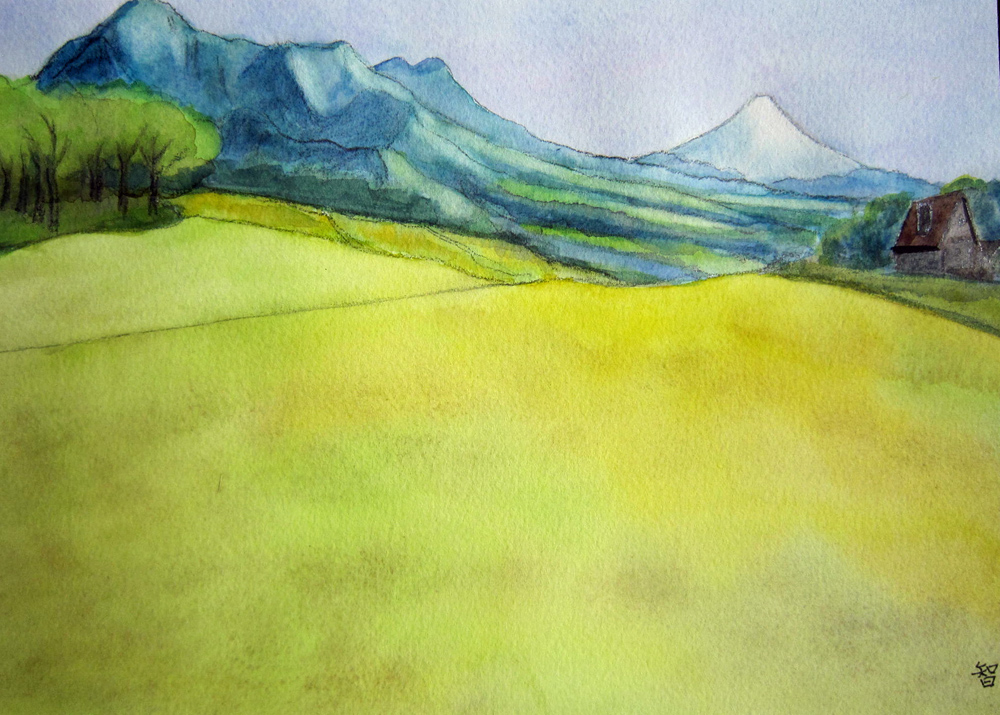 作品5 八ヶ岳南麓からの風景5 [制作2011年2月] 春爛漫、富士山遠望 (左の山は、茅ヶ岳(カヤガタケ)) |